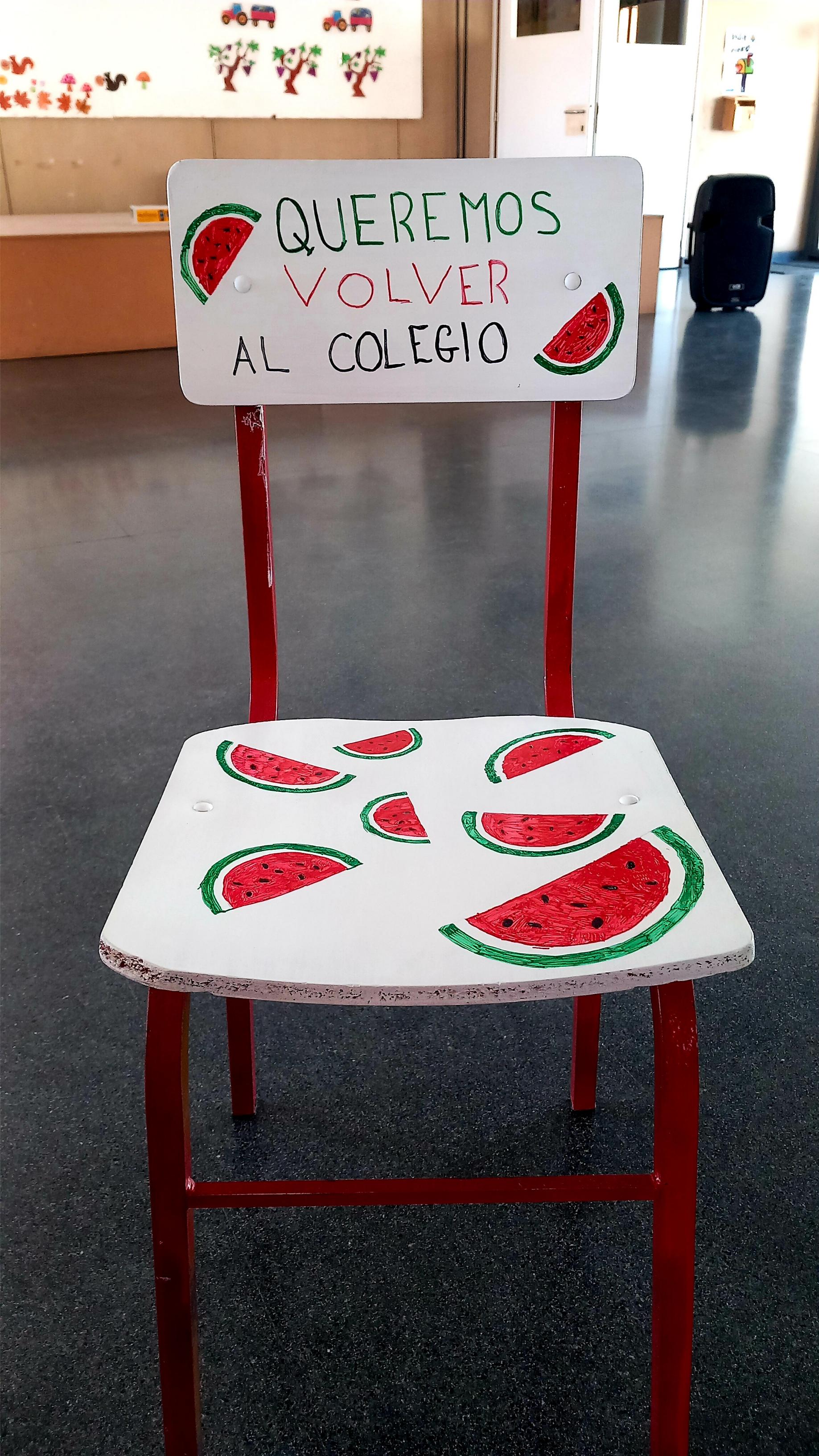 Además, se pintó una silla con los colores de la bandera de Palestina, en representación de todos esos niños y niñas a los que se les ha arrebatado el derecho de asistir al colegio y recibir una educación.